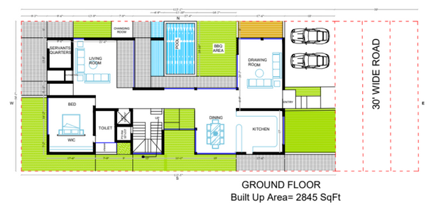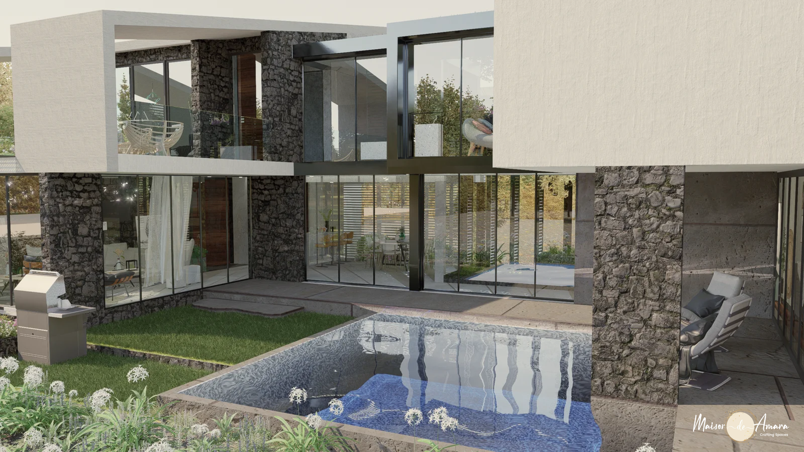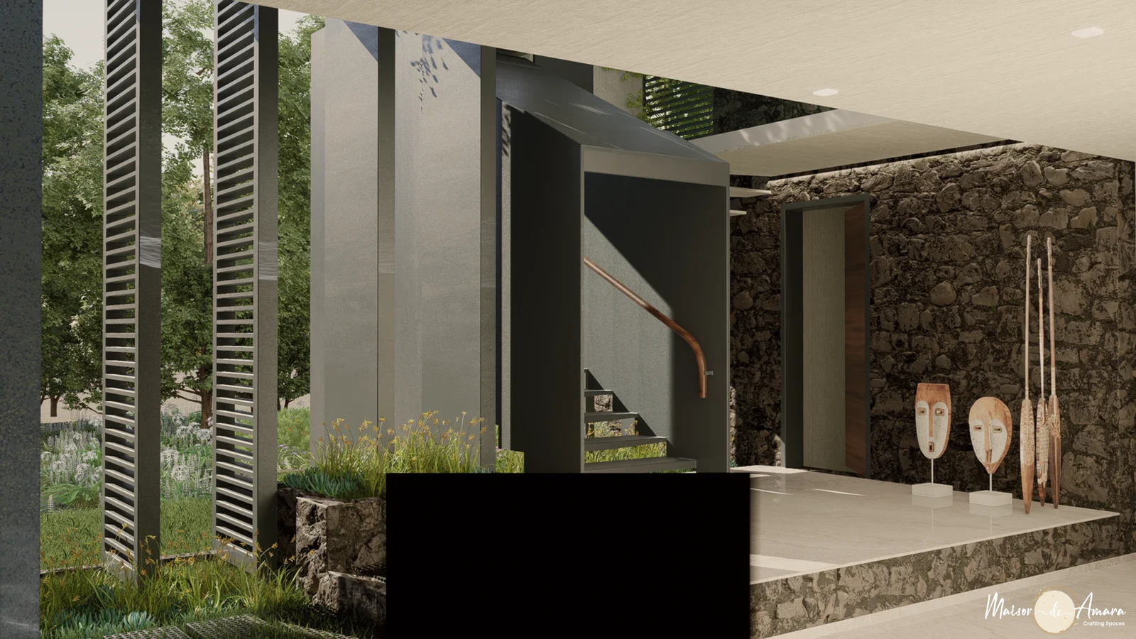 The villa design is a linear residence split in to two blocks that are connected with a bridge to foster interaction. The bridge acts as a gallery that brings the outside in. It is a place to unwind and relax while giving the house its unique feature. A key highlight are the depth and shadows created by the moving light filtering in through the skylight above the stairs.