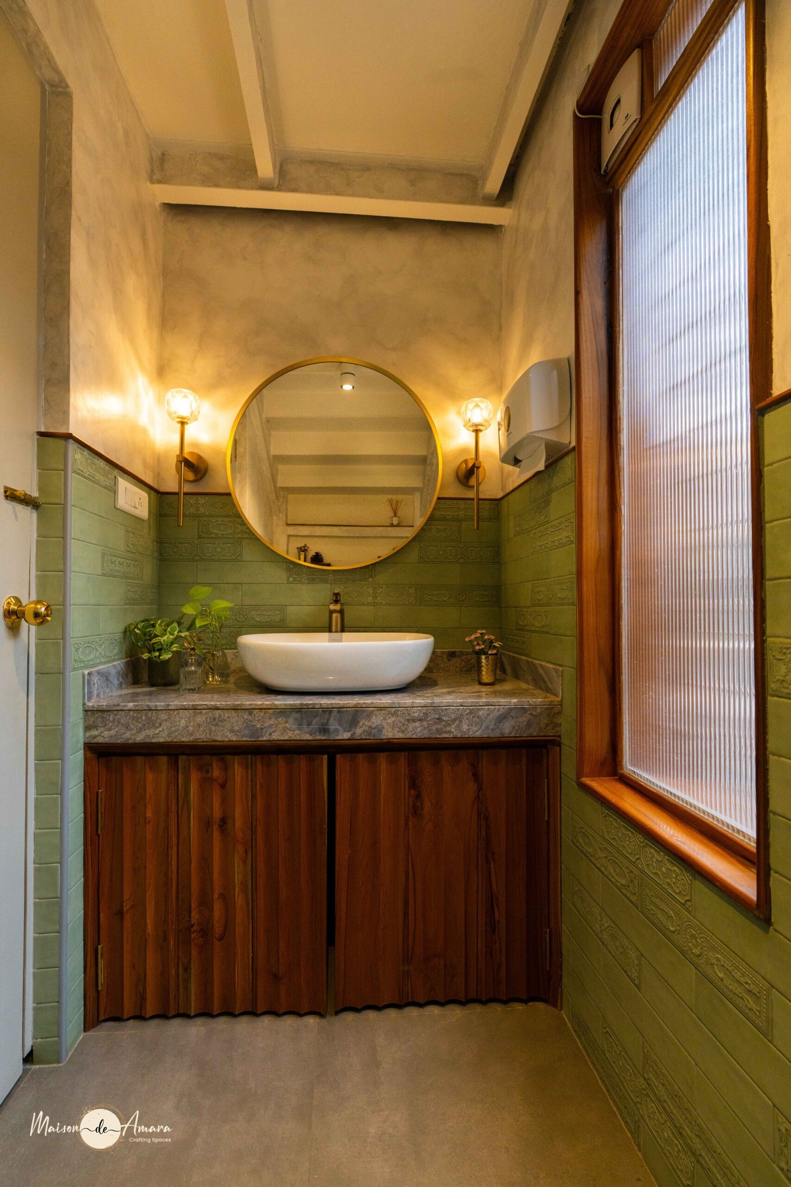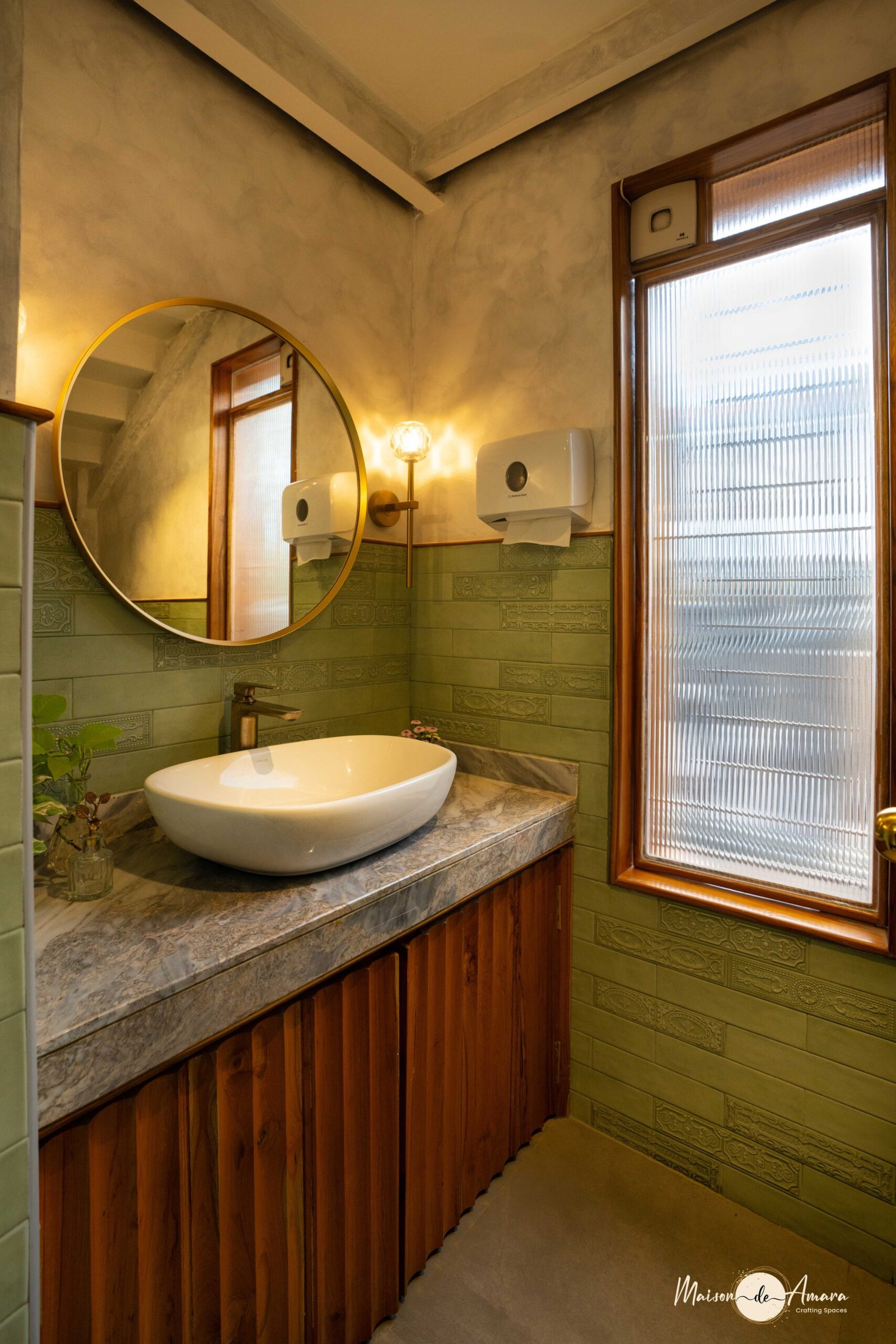 This project entailed botanical themes, while keeping vintage modernism subtly entwined in the aura of the space. Luxurious yet playful, this Indian Design House had us using fluted glass, earthy tones and brass and gold components.