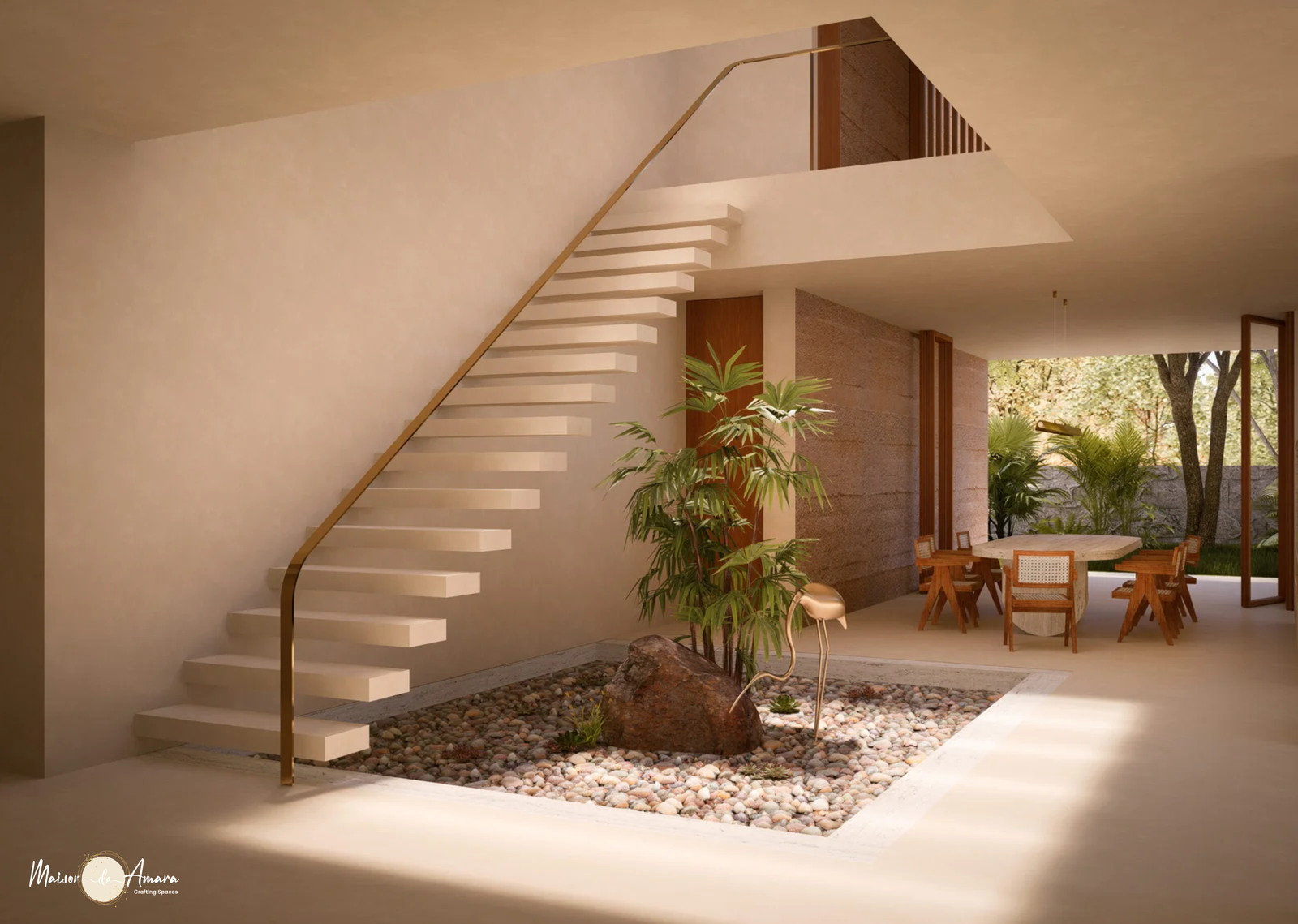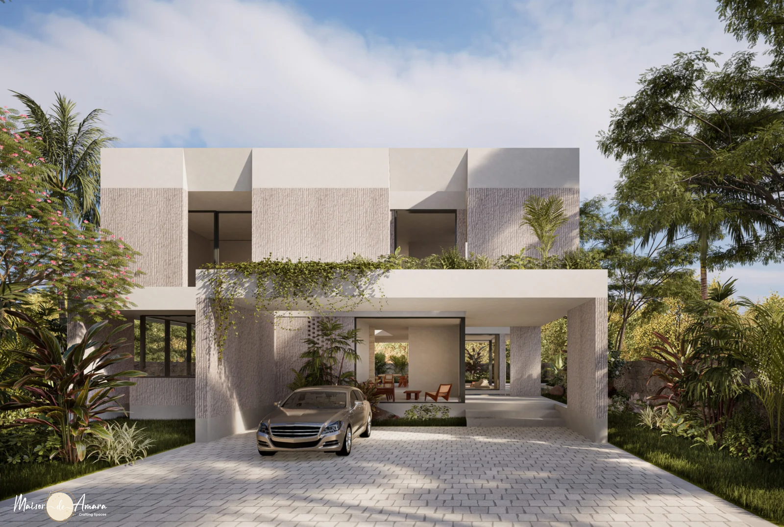 In this exceptional design, an east-facing orientation welcomes the morning sun and establishes a seamless connection between the indoors and nature.The layout ensures effortless movement, prompting unity and coherence throughout. A striking double-height open space at the core of the design adds grandeur and a visual link to the above floor. The living and dining areas extend to a covered exterior, blurring boundaries and inviting the outdoors in.A contemporary minimal aesthetic fosters a serene living environment, complementing the natural surroundings. This residence is a testament to modern architectural excellence, balancing form and function for contemporary living in harmony and nature.